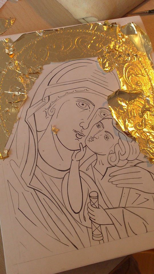Nel contesto delle icone sacre, si utilizza la doratura a guazzo, un metodo tradizionale che prevede la stesura di una base composta da bolo armeno (un’argilla rossa finissima) e colla animale, su cui viene applicata la foglia d’oro con un leggero soffio d’acqua.