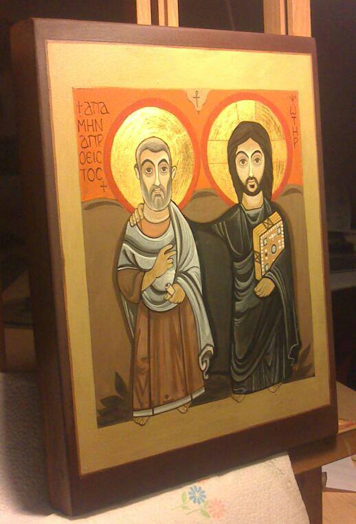 Il Cristo è raffigurato a pieno corpo e in piedi. L’iscrizione posta a destra del capo lo designa come psoter, forma copta del greco soter ossia SALVATORE. Il capo è posto contro un grande nimbo d’orato. Veste i tradizionali abiti, il viso è incorniciato da una folta barba, gli occhi grandi e ben aperti, incorniciati da marcate e irregolari sopracciglia, sono diretti al fedele come per scrutarlo, la mano sinistra stringe al petto un libro riccamente ornato, la mano destra, è posta familiarmente sulla spalla del Santo.