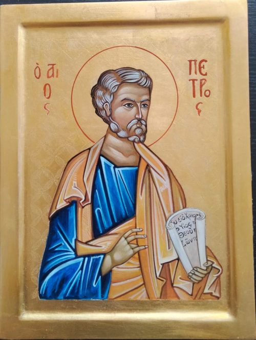 San Pietro è caratterizzato dalla fluente capigliatura e la folta barba, entrambe bianche. Sono simboli per comunicare che ci troviamo di fronte ad un anziano (presbitero), ad un saggio. Mentre con la mano destra benedice, la sinistra presenta un “rotolo”, simbolo delle Lettere da lui scritte. Anche il mantello e la stola, con il loro colore oro, richiamano fortemente l’idea dell’autorità di Pietro (Primato) all’interno del collegio apostolico. San Pietro non guarda direttamente chi si pone di fronte all’icona, quasi a suggerire che egli non ne è il protagonista, lasciando così spazio alla contemplazione del rotolo della Parola.
