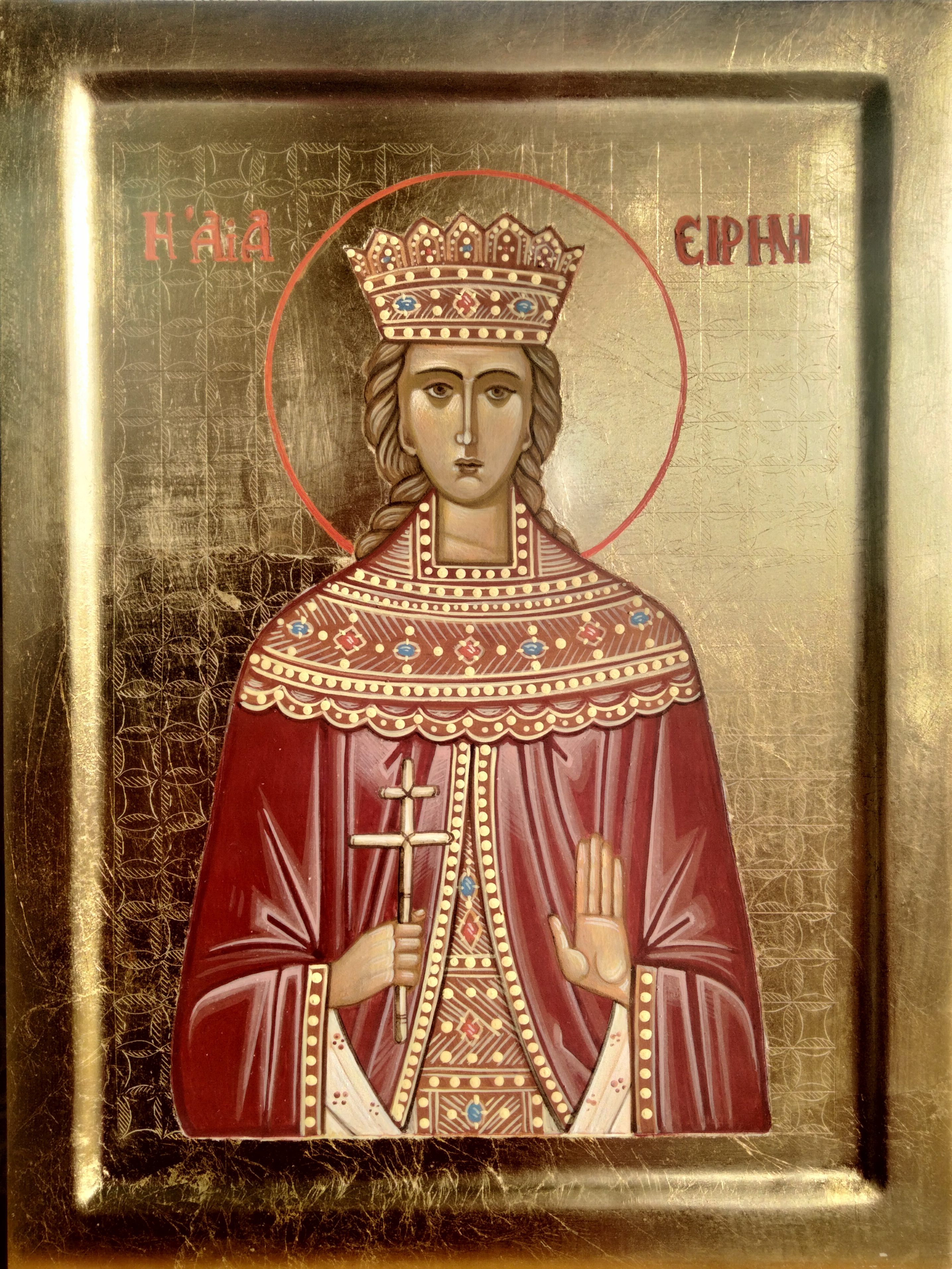 Iconografia: Sant’Irene è raffigurata come una ragazza ricca e di nobili origini, vestita con abiti eleganti e una corona; talvolta tiene in mano una croce o un ramoscello di palma, simbolo del martirio.