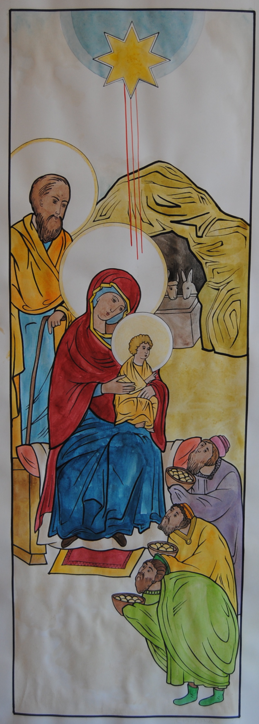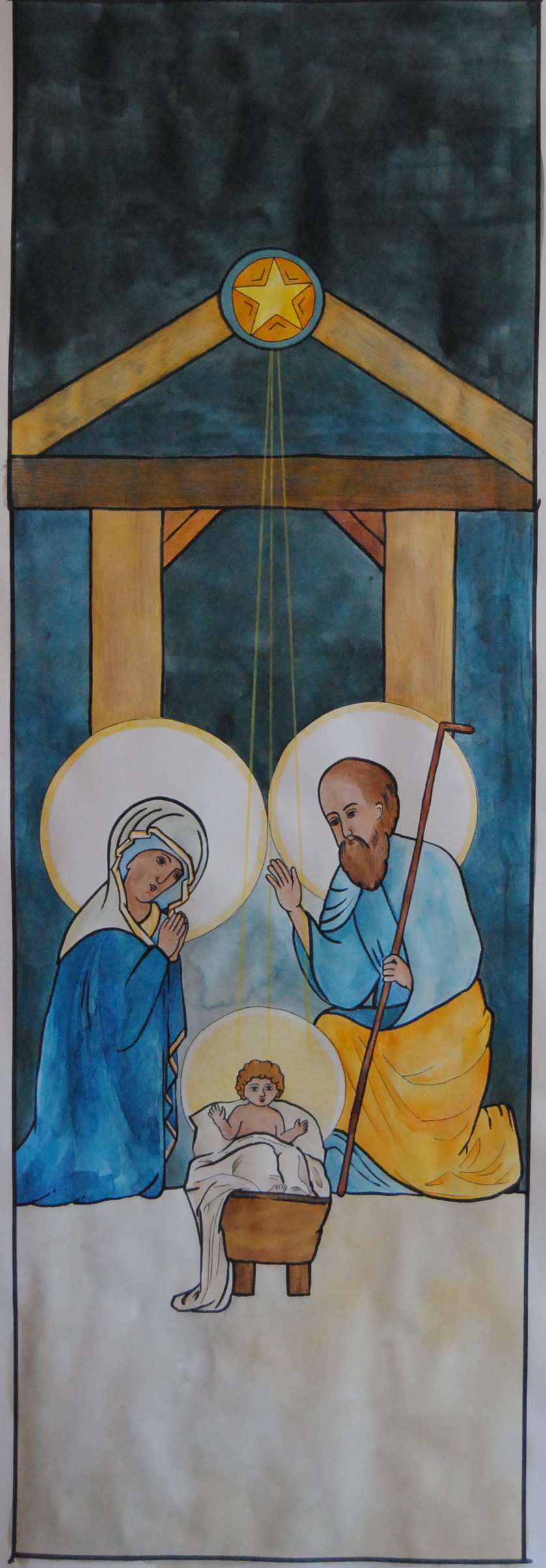 Nel 2012 ho realizzato, per Don Filippo Raimondi e la comunità della Parrocchia di San Giuseppe a Collegno (TO), un progetto un po’ speciale e diverso dal solito: conservando lo stile e i caratteri tipici delle icone ho realizzato ad acquerello i disegni di 15 festività che poi sono stati stampati su pellicole e applicati alle vetrate della chiesa (allestite dalla ditta Application Team di Torino).