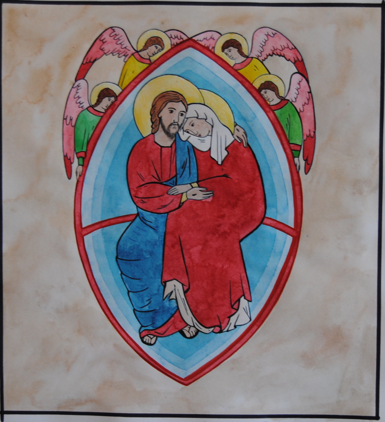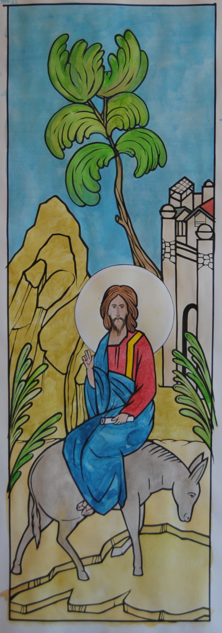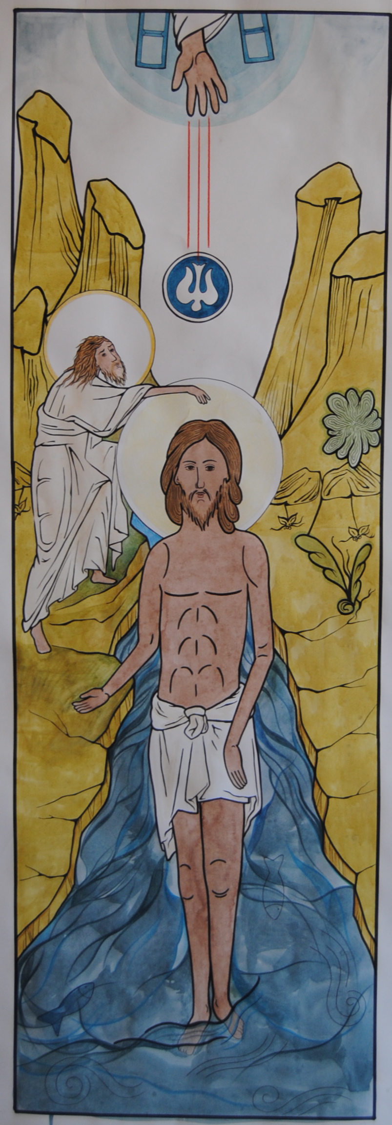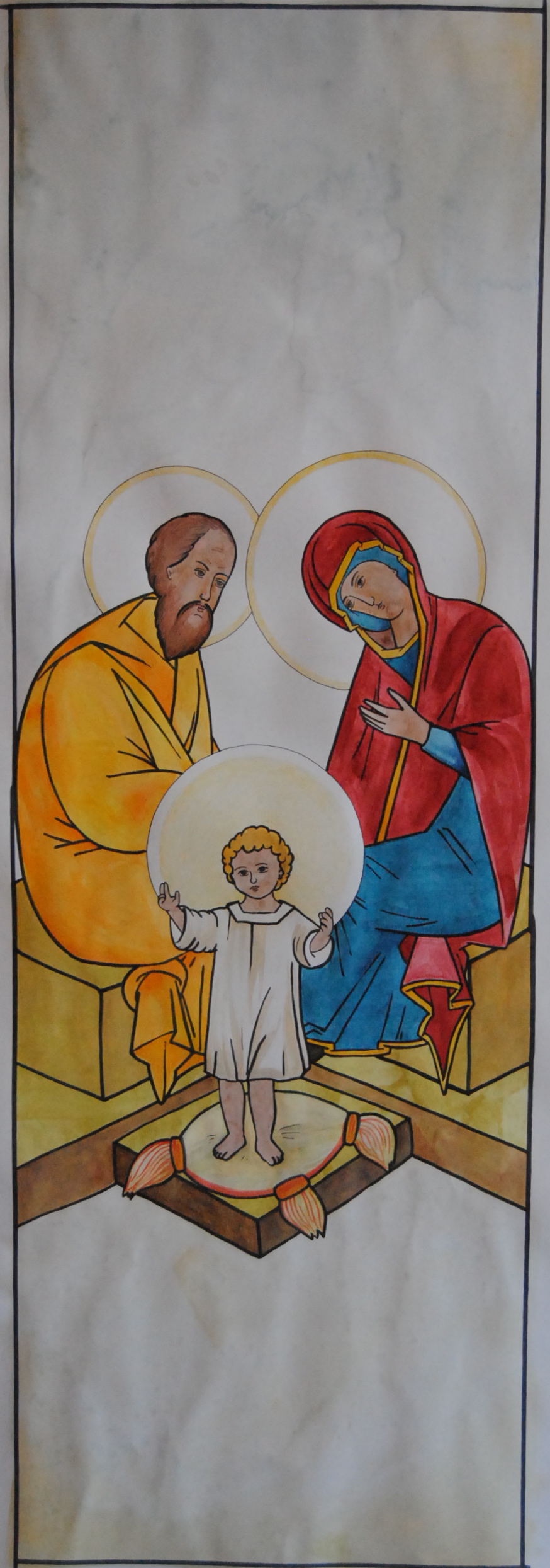 Chi lavora sulle icone, in realtà, copia dei modelli preesistenti. Rinuncia a “fare l’artista” per farsi strumento di Dio per rappresentare la sua immagine. Così ho fatto io. Ho realizzato i disegni in scala scegliendo icone che corrispondessero al soggetto che mi era stato affidato, le ho dovute rielaborare adattandole agli spazi e le ho disegnate usando semplici acquerelli su cartoncino.